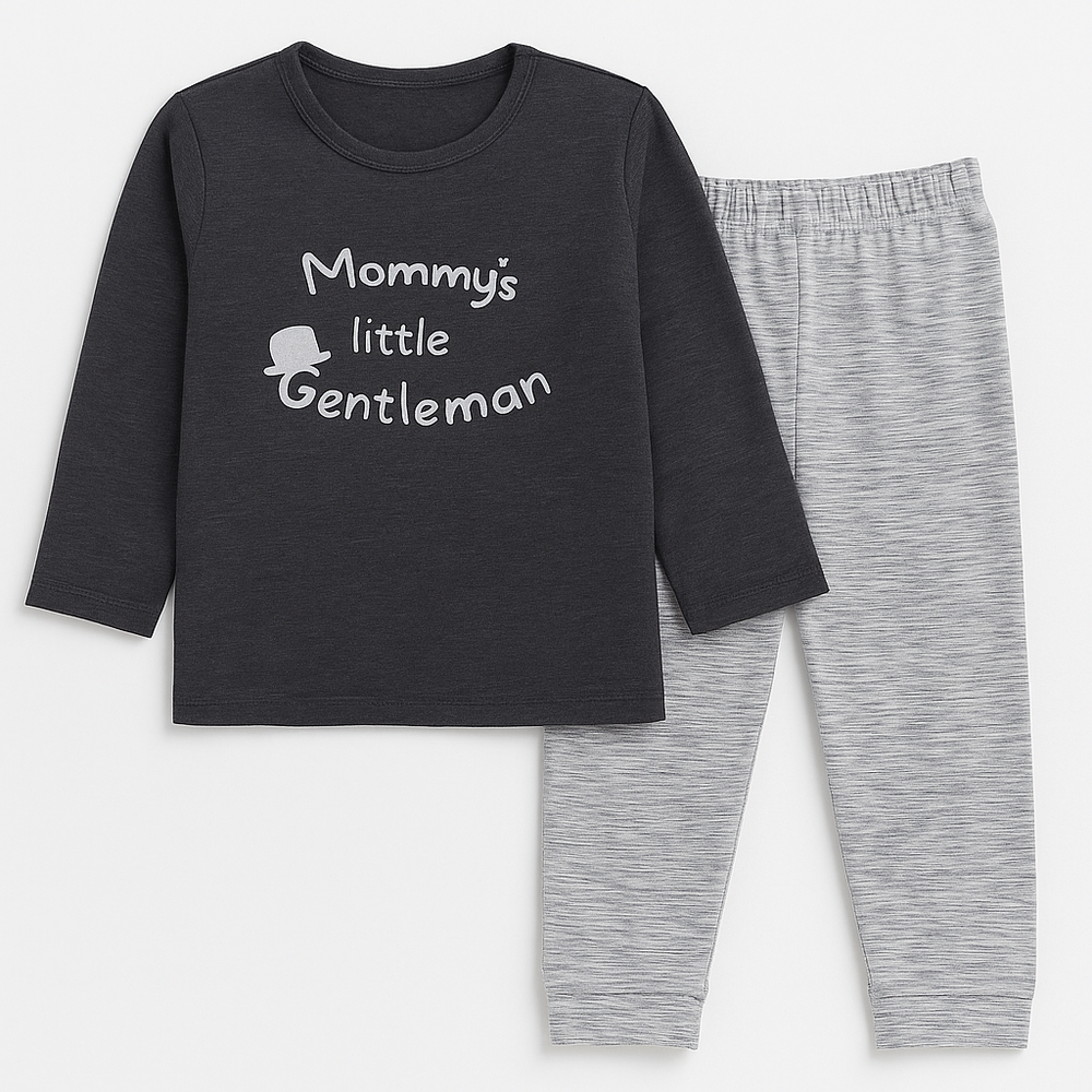 Shop this stylish boys’ cotton pajama set featuring a trendy “Mommy's Little Gentleman” long-sleeve top and matching striped pants. Perfect for cozy nights, playtime, and lounging. Soft, breathable fabric ensures all-day comfort for kids. Available now with fast delivery across Pakistan.
