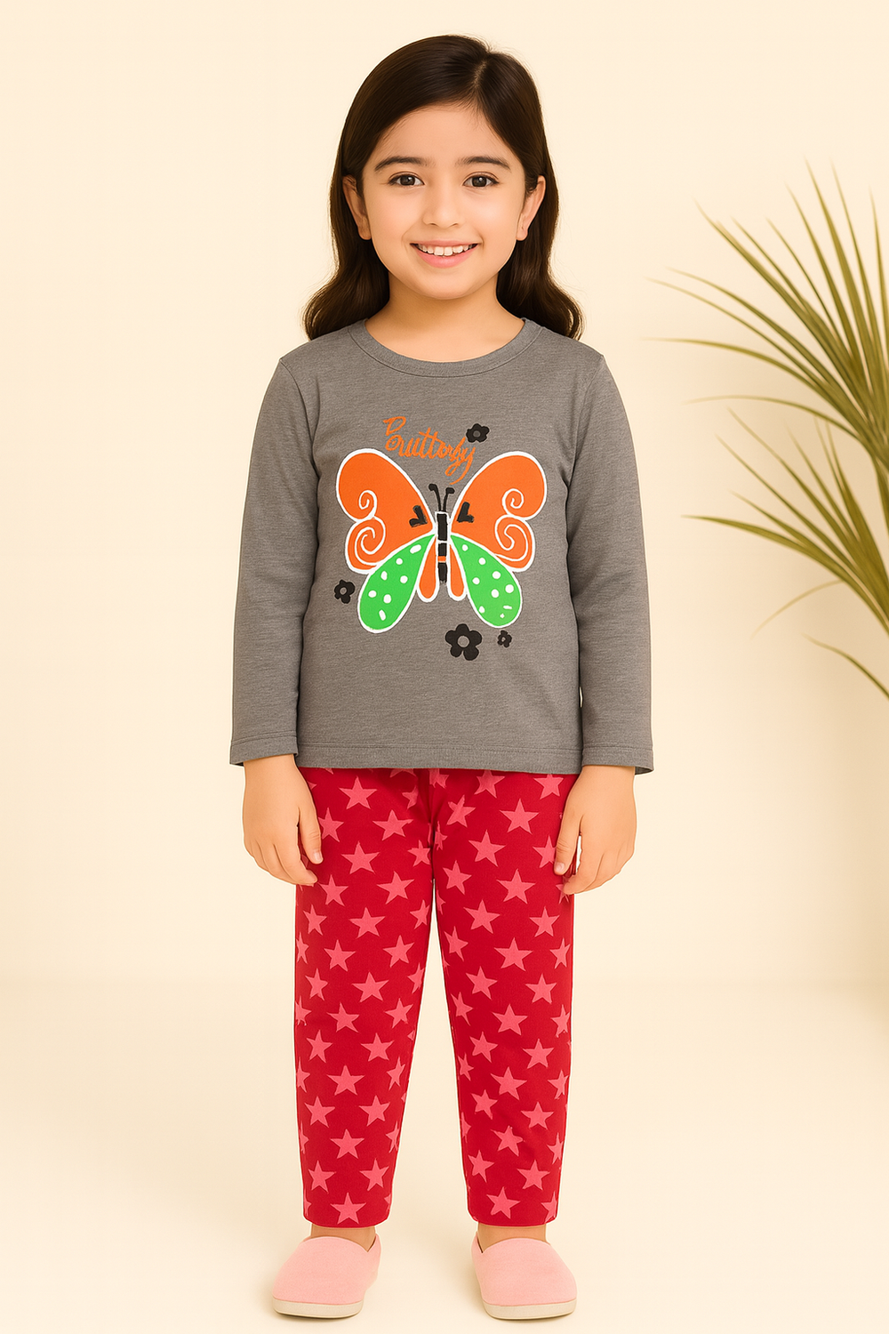 Cozy girls pajama set featuring a vibrant butterfly top & red star-print pants. Soft cotton, perfect for nightwear or lounging. Sizes for ages 7–8.